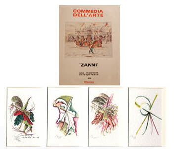 | NOTE | n. 4 watercolours by hand on reproduction with envelope explanation on the figures first mask "Commedia dell'Arte" | ||