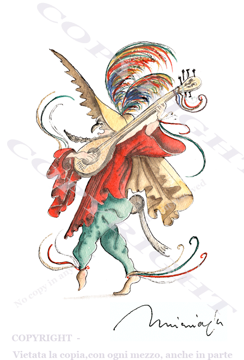 | NOTE | Original pictures bifore in pencil, ofter in pen ink and waterlolour on hamp, linen and canvas paper, executed completely by hand, since 1983 Gold and red frame by artist | ||